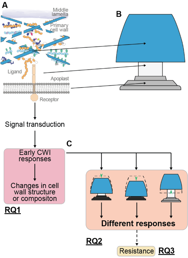 The Watchers on the Wall project aims to identify how mechanical and chemical properties of the cell wall change during the initial phases of PTI and how these changes activate CWI monitoring systems. Key questions include: