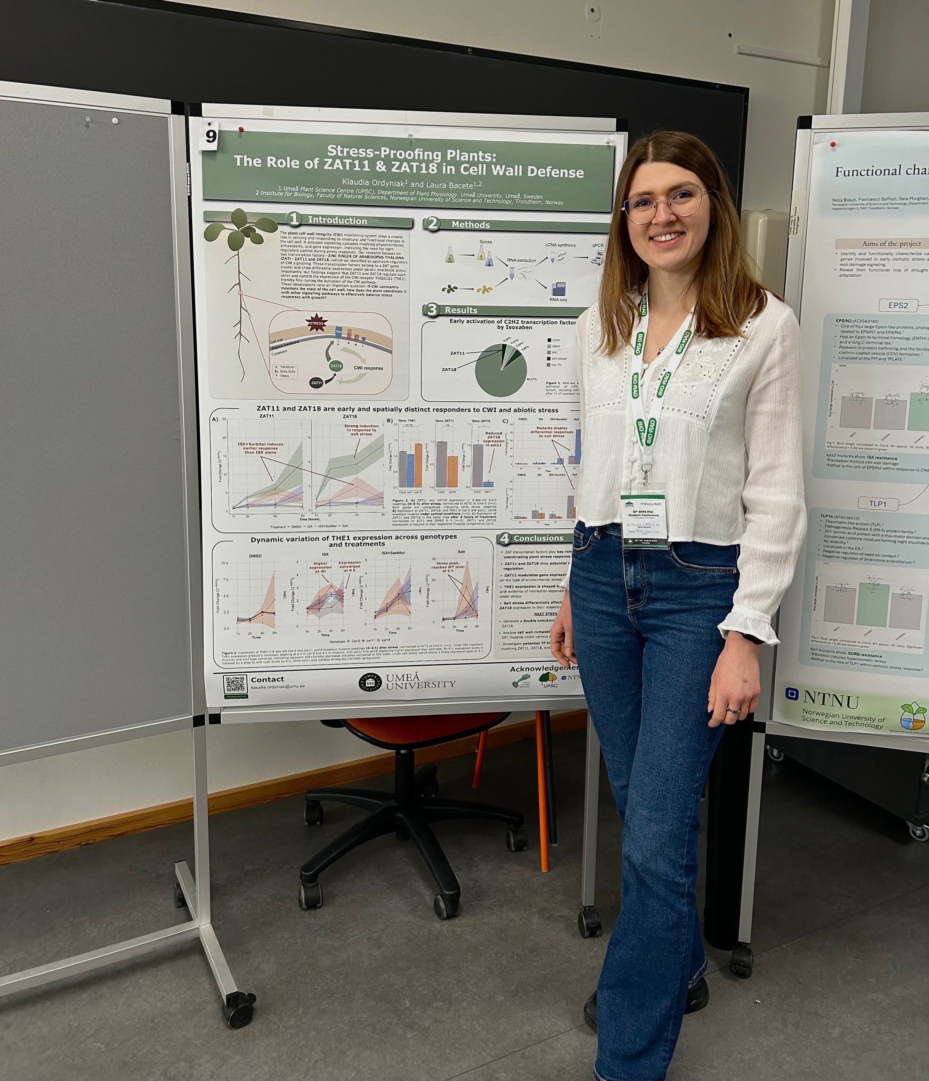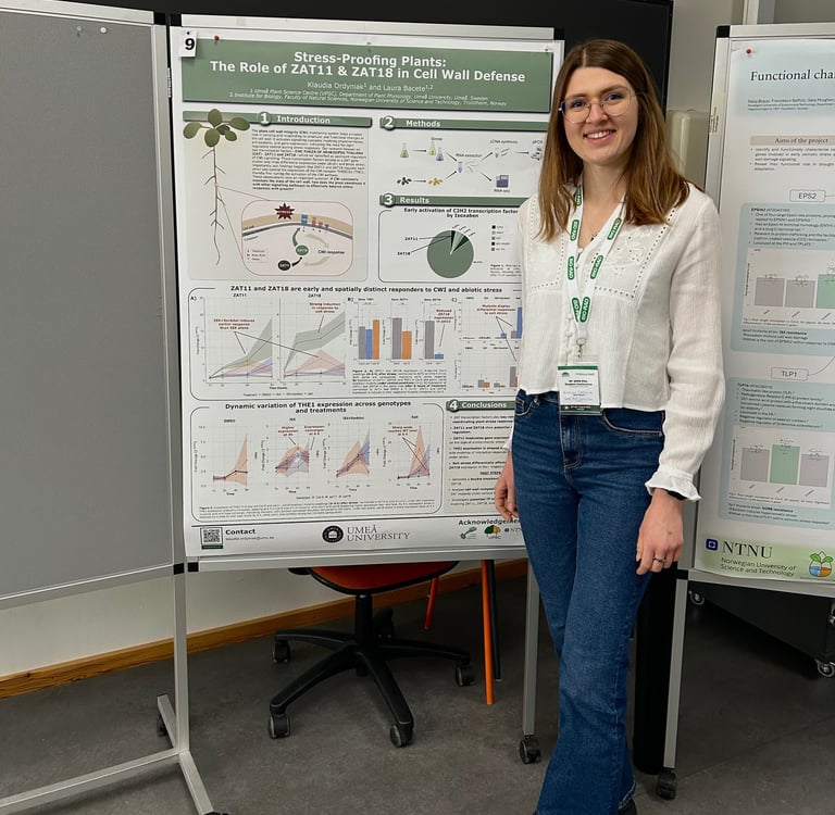 Klaudia’s poster, “Stress-Proofing Plants: The Role of ZAT11 & ZAT18 in Cell Wall Defense”, told the story of two transcription factors, ZAT11 and ZAT18, as central players in the cell wall integrity (CWI) pathway. Her work revealed that these transcription factors do not act in isolation: they regulate each other’s expression and influence the activity of the CWI receptor THESEUS1, a key node in translating wall damage into cellular responses. By combining RNA-seq data, mutant analysis, and stress assays, she showed how ZAT11 and ZAT18 respond differently to stresses such as salt and cellulose inhibition, offering new insight into how plants fine-tune their defences while maintaining growth.